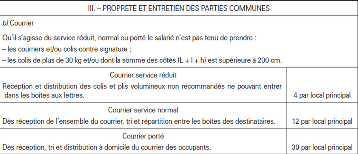 Ainsi, un gardien d’immeuble n’est pas tenu de prendre, pour le compte des copropriétaires, notamment les lettres recommandées, les colis contre signature, les colis de plus de 30 kg ou ceux dont la sommes des côtés est égale à plus de 200 cm.